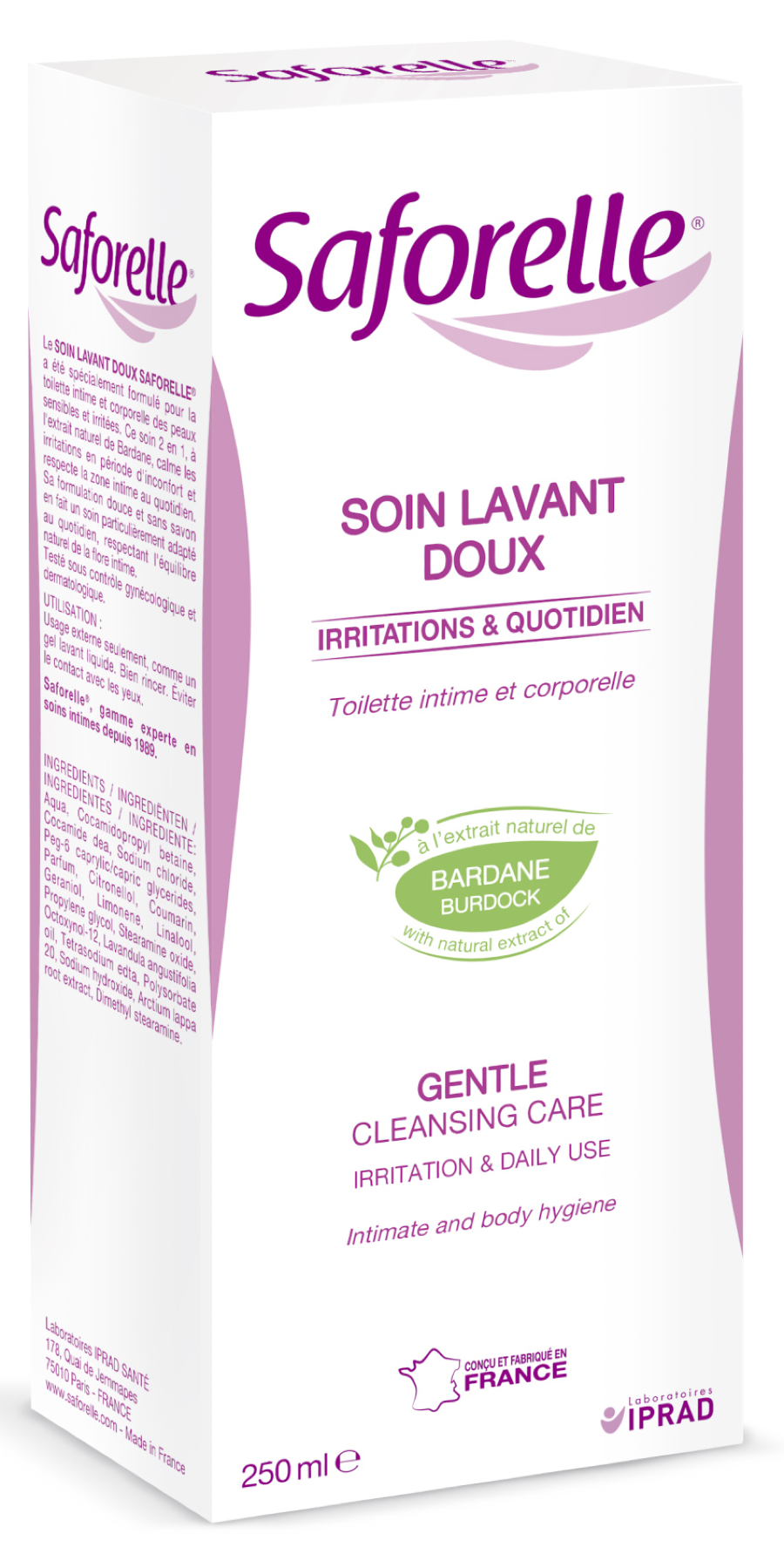 Средство для интимной гигиены Saforelle Бережное очищение реализуется в индивидуальной упаковке — флаконе. Объем — 250 мл. В его составе содержатся следующие компоненты: Aqua, Cocamidopropyl Betaine, Cocamide DEA, Sodium chloride, PEG-6 Caprylic/Capric Glycerides, Parfum, Propylene Glycol, Polysorbate 20, Stearamine oxide, Lavandula angustifolia oil, Tetrasodium EDTA, Sodium Hydroxide, Arctium Lappa Root Extract, Dimethyl Stearamine.