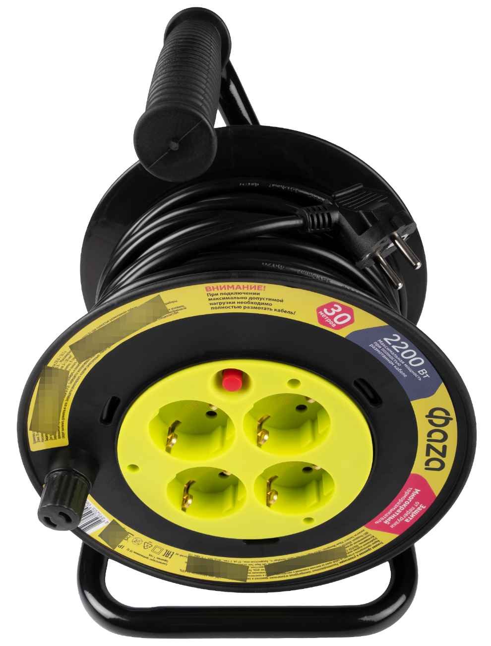 Удлинитель силовой на катушке Фаzа / Фаза CRG-04-3000, провод ПВХ черный, 4 розетки, 230В, 10А IP20, 30м / электрика