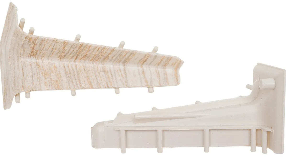 Позволяет аккуратно состыковать плинтус во внутренних углах без обрезания планок под 45 градусов. Деталь представляет собой внутренний угол с фигурно изогнутым краем, который подойдет для плинтуса. Коллекции плинтуса дополнены комплектующим подходящих цветов. Детали из ПВХ легко крепить к основным элементам плинтуса. Специальный крепеж с внутренней стороны вставляется в паз планок и надежно фиксируется.