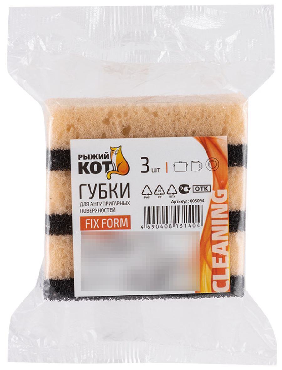 Губки для антипригарных поверхностей Рыжий кот Fix Form сильно отличаются от привычных цветных губок для посуды, губки состоят из 2 чистящих слоев: крупнопористого поролона натурального цвета (без применения красителей) и ретикулированного пенополиуретана Policell. Размер — 60×93×30 мм. Количество — 3 шт.