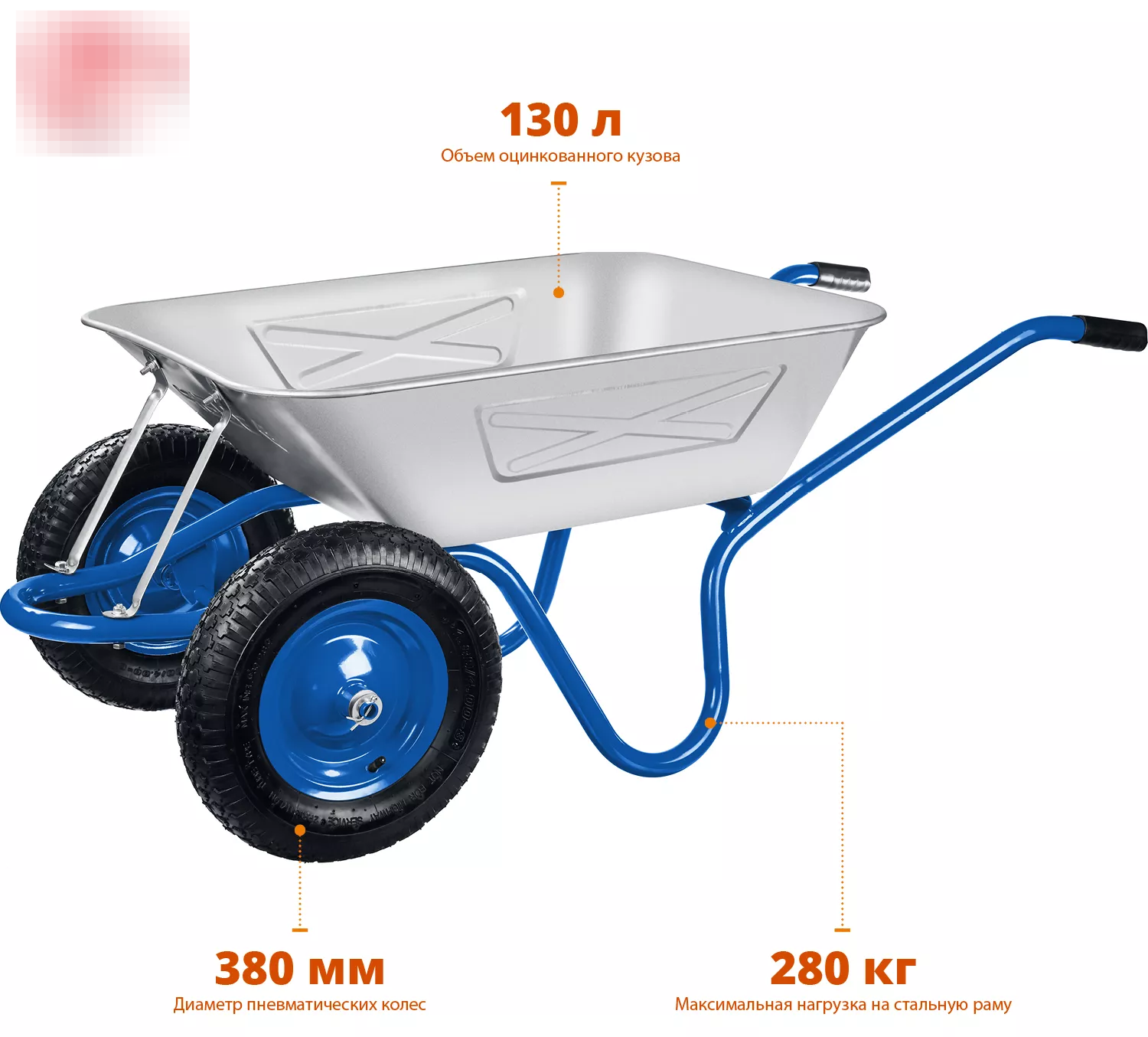 Тачка садовая Зубр выполнена из оцинкованной стали. Способна выдержать максимальную нагрузку в 280 кг. Объем кузова — 130 л. Толщина стали — 0.9 мм. Диаметр колес — 380 мм.