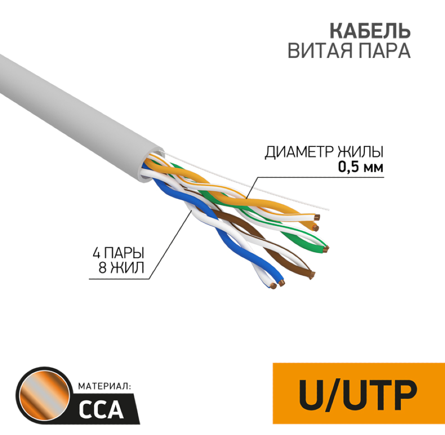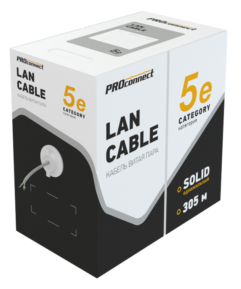 Кабель информационный PROconnect / Проконнект Indoor solid 24AWG 4PR, витая пара, омедненный CCA ПВХ серый, U/UTP, cat5e, 4 пары, 5.1мм, 305м / электрика