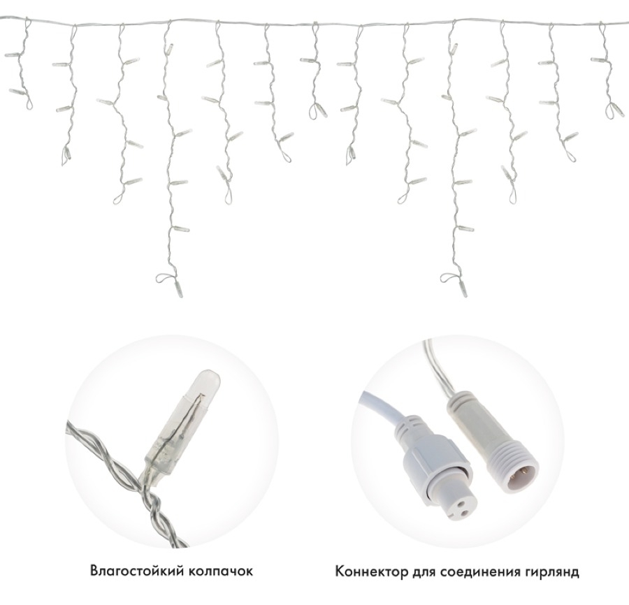 Гирлянда имитирует сосульки и может послужить оригинальным решением при украшении карнизов, арок, фасадов зданий, витрин магазинов, а также стать эффектным элементом декора внутри помещений.