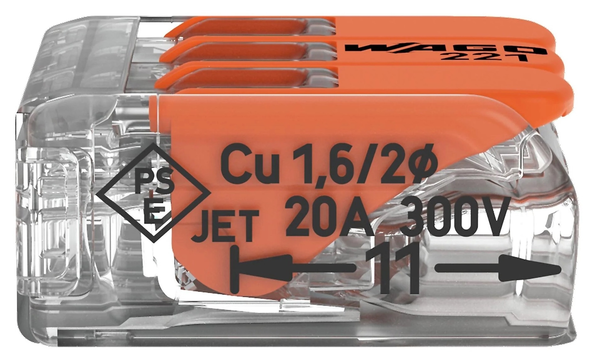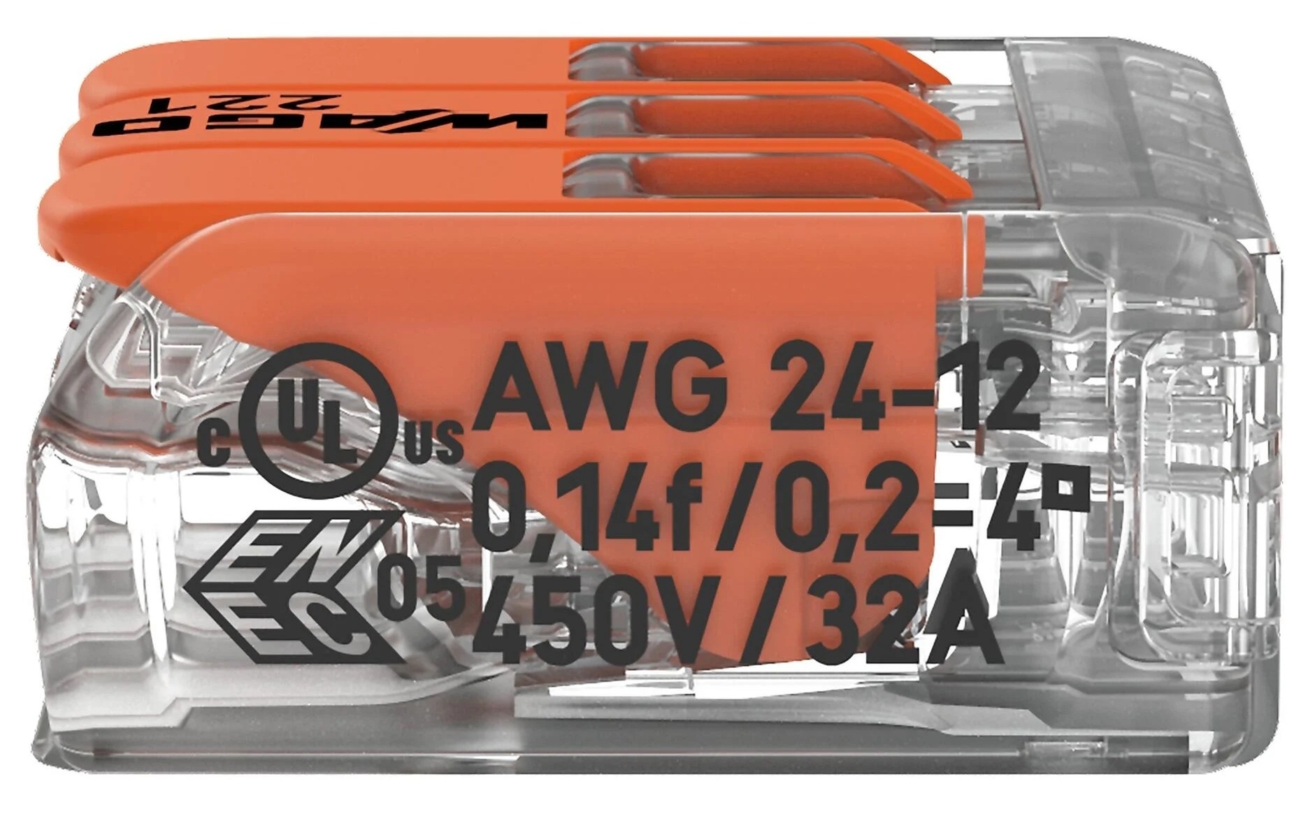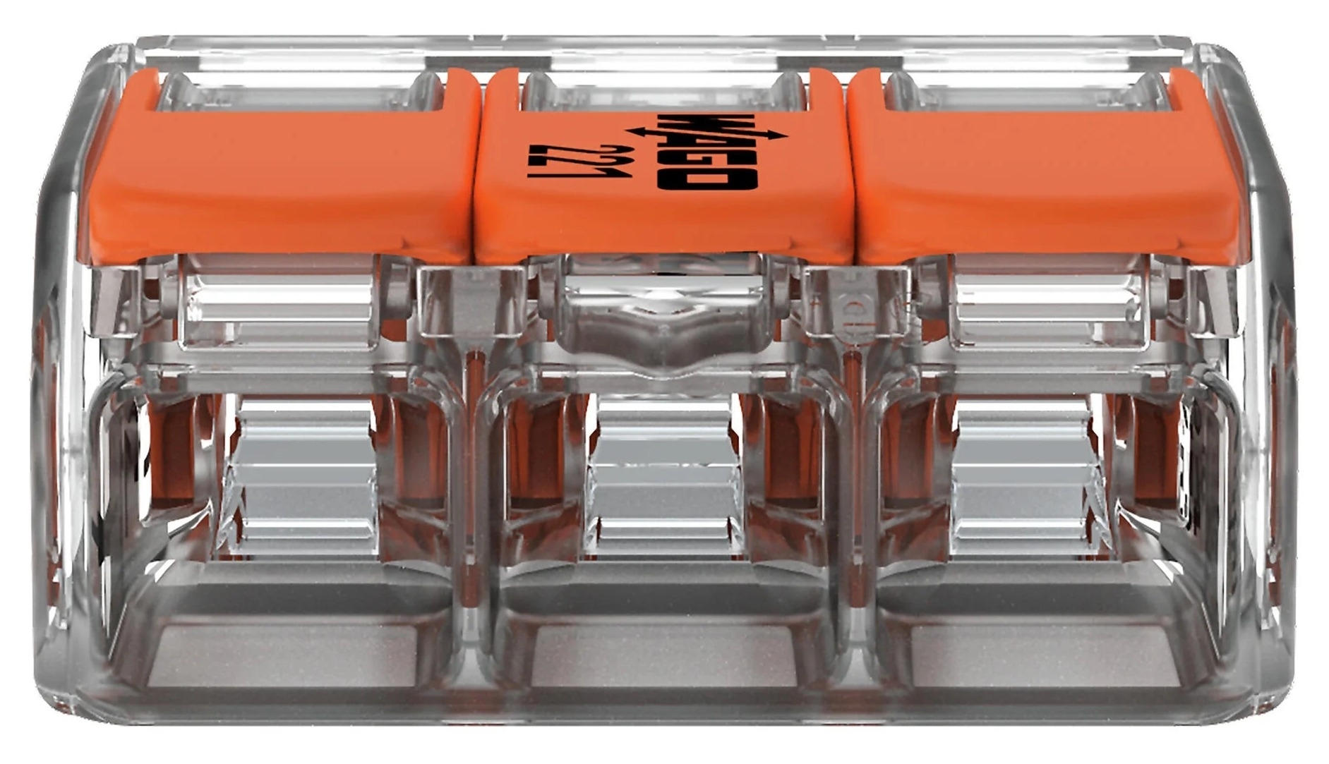Соединительная 3-х проводная клемма WAGO 221-413 состоит из прозрачного пластикового корпуса, в который встроена клеммная колодка. Изделие используется для создания соединения многожильного или одножильного кабеля. Клемма имеет удобные рычажки для ее открытия и закрытия. У этого способа скрепления есть ряд преимуществ: высокая скорость соединения, надежность и удобство дальнейшей работы с проводами, их обслуживания. Проводящая часть соединителя изготовлена из меди. Специальное отверстие для тестера на тыльной стороне колодки позволяет проверить параметры соединения, не вскрывая корпус.