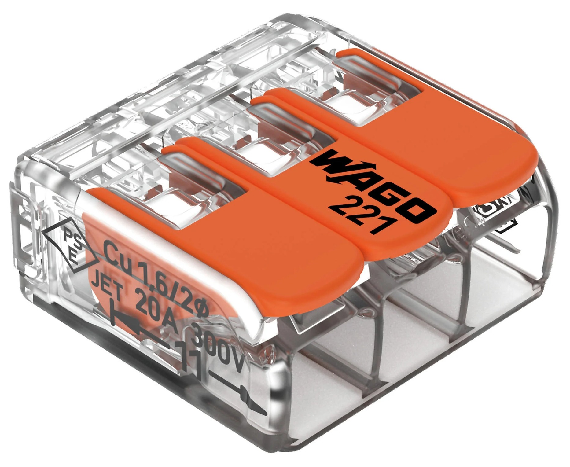 - Клемма Wago 221-413 монтажная, 3-х проводная - 1 упаковка.
