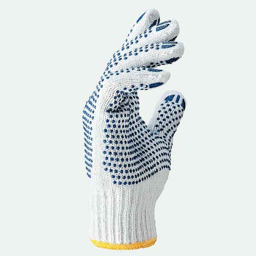 Хлопчатобумажные перчатки 5078919 от компании 888 с ПВХ точками предназначены для защиты рук от загрязнений и механических повреждений во время погрузо-разгрузочных, строительных и упаковочных работ. Безопасность при работе в перчатках увеличивается благодаря удлиненным манжетам. Характеристикой данных трикотажных перчаток является повышенная плотность вязки 10 класса – 10 петель на дюйм и совокупная толщина хлопчатобумажной/смесовой нити 124 текс. От производственных загрязнений лучше всего защищает более плотная вязка. Благодаря полимерному покрытию ПВХ перчатки устойчивы к истиранию и защищены от скольжения.