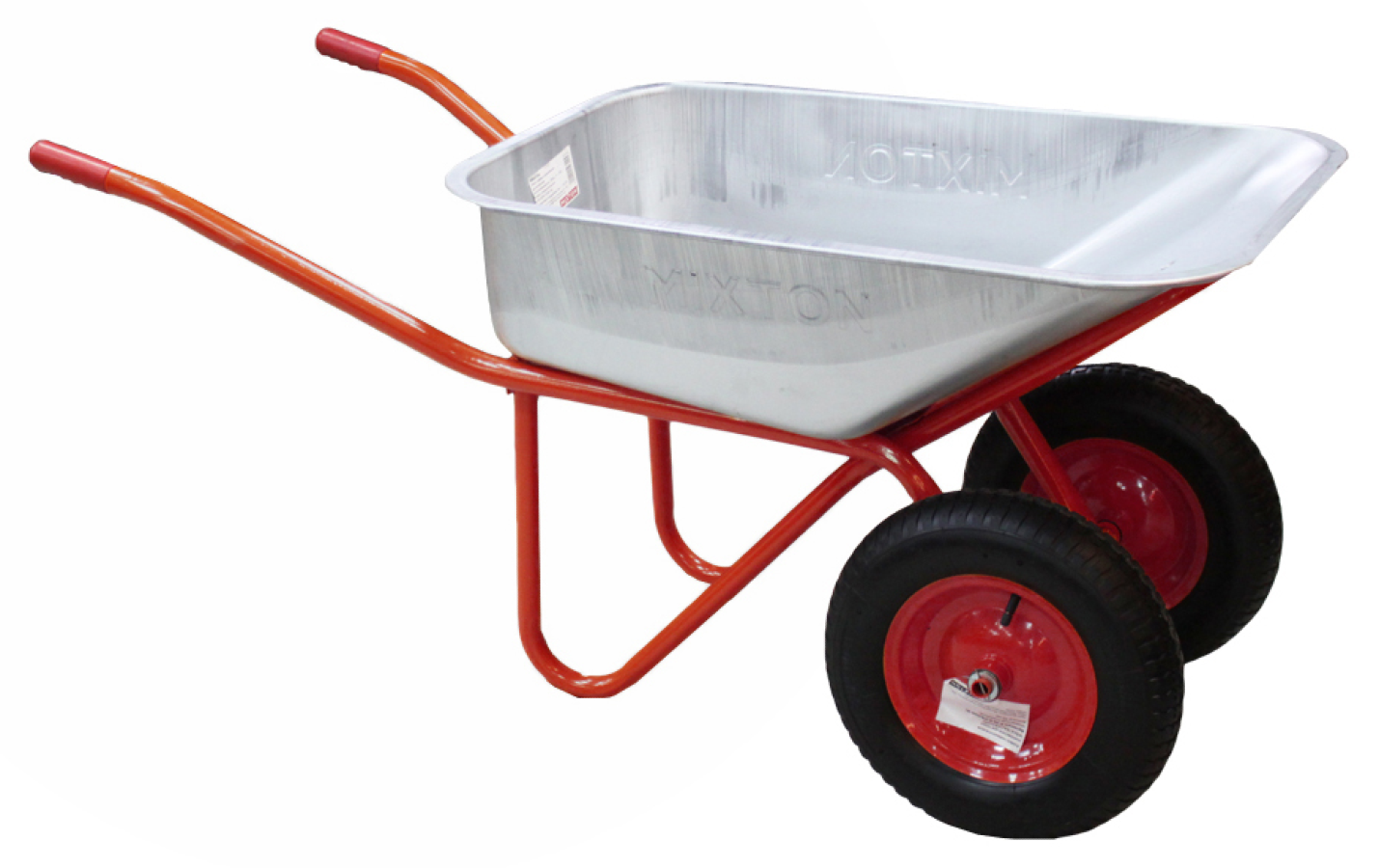 Тачка садовая Mixton выполнена из оцинкованной стали. Способна выдержать максимальную нагрузку в 300 кг. Объем кузова — 90 л. Диаметр колес — 380 мм. Посадочный диаметр — 20 мм.