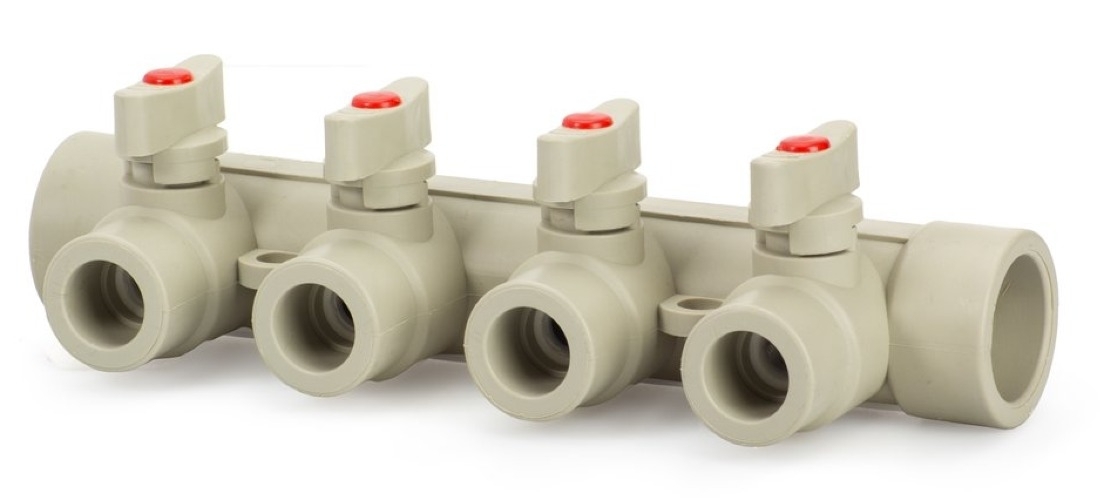Коллектор с шаровыми кранами ppr 32×4 серый Lm31081004032G — Устройство с отсечными кранами, применяемое в системах отопления, теплых полов, водоснабжения для распределения потоков рабочей среды трубопроводов.