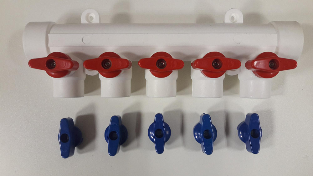 Коллектор оснащен встроенными отсечными (запорными) шаровыми кранами на отводах. Условный диаметр корпуса — 32, присоединяемых труб — 20 мм. Число выходов — 5.