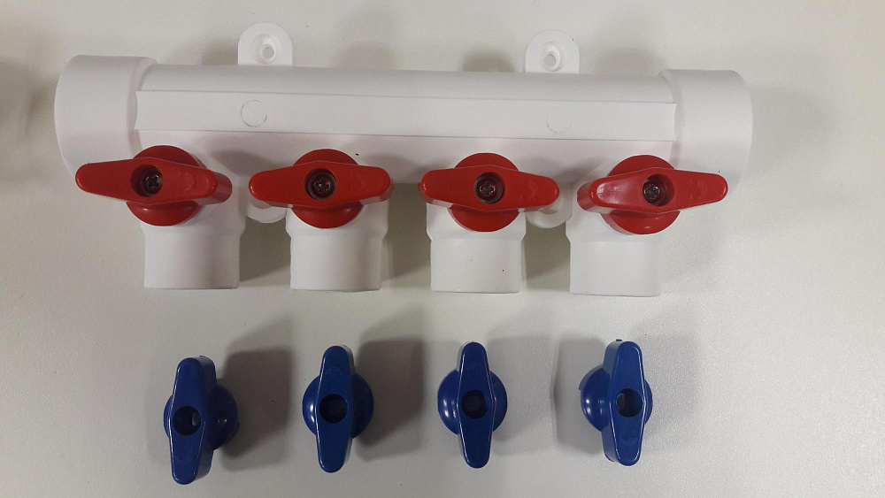 Коллектор оснащен встроенными отсечными (запорными) шаровыми кранами на отводах. Условный диаметр корпуса — 32, присоединяемых труб — 20 мм. Число выходов — 4.