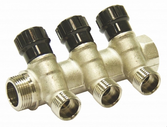 Коллектор ¾» на 3 выхода диаметром ½» с вентилями применяется в трубопроводах систем горячего и холодного водоснабжения, многоконтурных установках водяного отопления (напольного, радиаторного с лучевой разводкой). В системах водоснабжения распределительный коллектор снижает взаимное влияние потребителей, обеспечивает равное входное давление. Применение коллекторов дает возможность отказаться от дополнительной арматуры — запорной, регулирующей, уменьшает число соединений, облегчает работу проектировщиков, монтажников, наладчиков инженерных систем. Вентиль на каждом выходе предназначен для регулирования расхода рабочей среды. Корпус коллекторов производится из высококачественной горячепрессованной латуни. На ручках вентиля имеется возможность указания потока «потребителя» — ванна, душ, раковина и т. д.